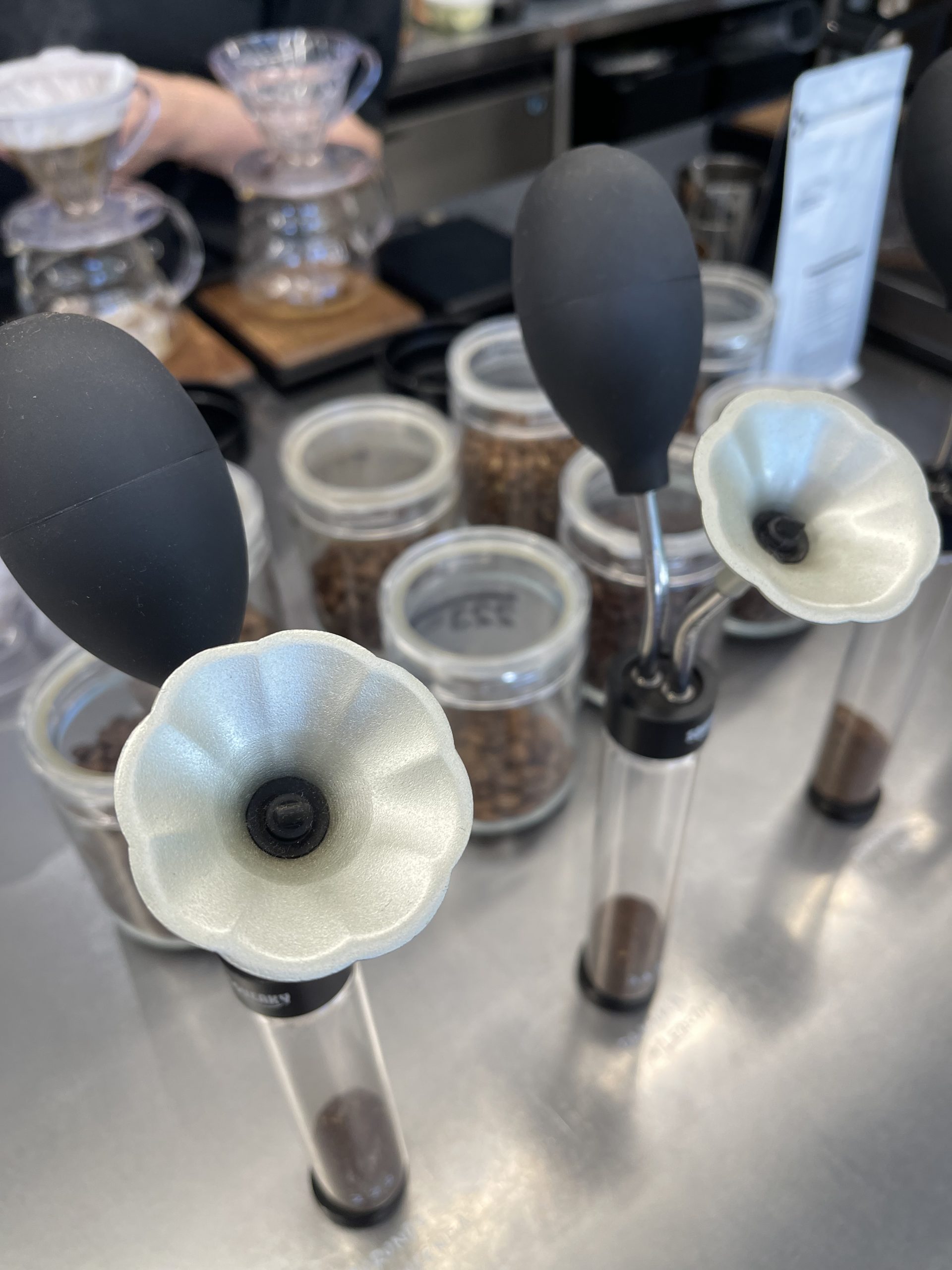 カウンターには豆の香りを楽しめるアイテムがお花のように並んでいて可愛い!香水をかけるかのようにシュコシュコ全種類の香りを試させていただきました。雑貨好きのワタクシはこういうの大好きなんですよね。たまらん(笑)